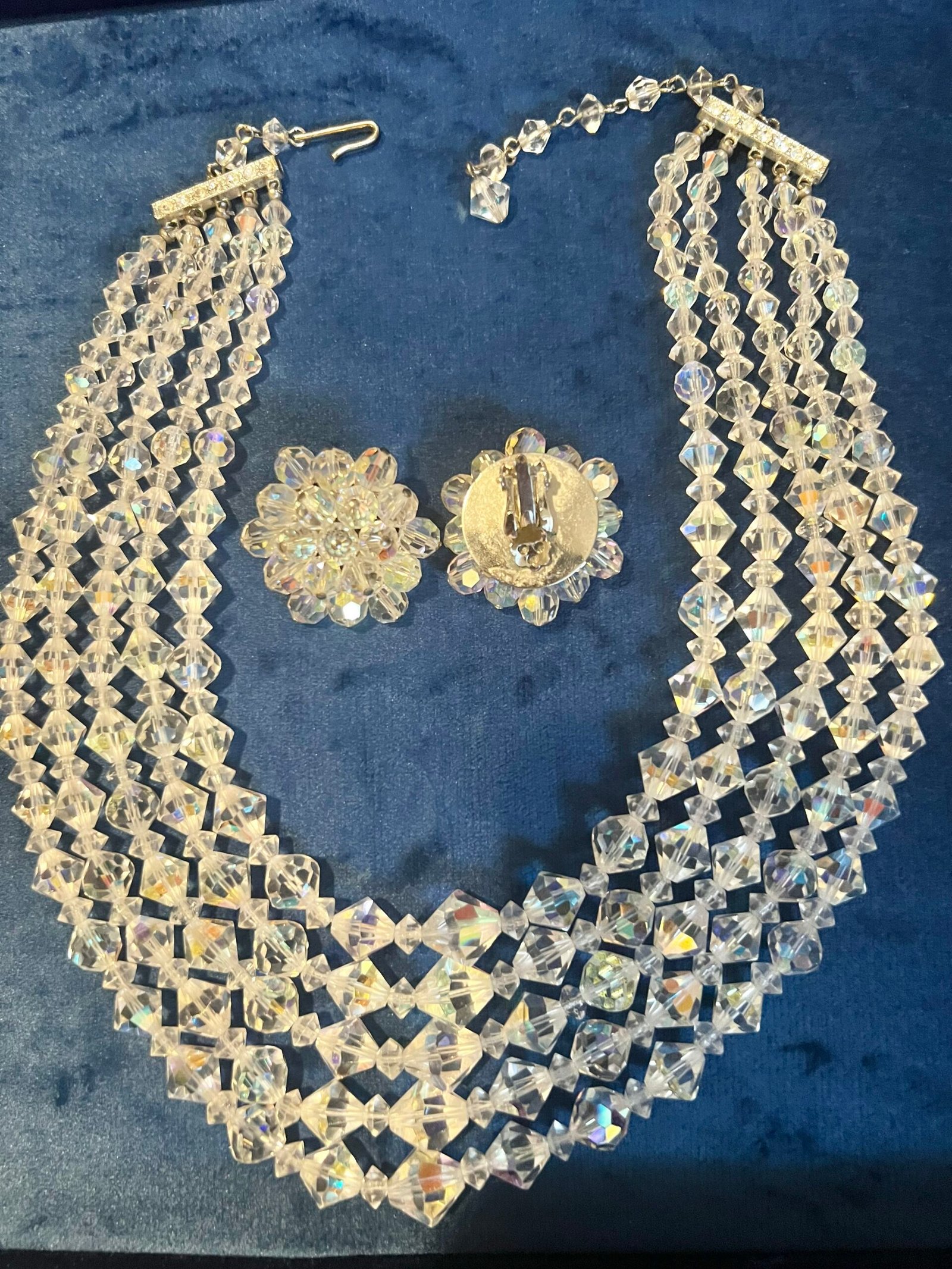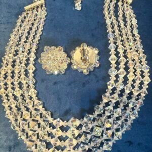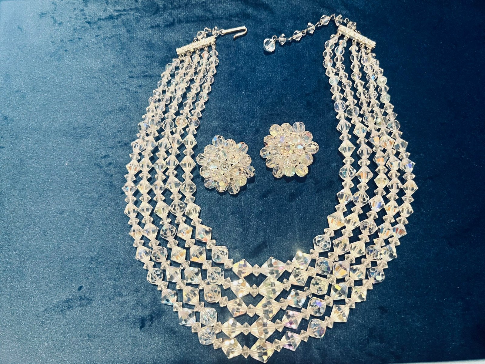 This vintage set carries a luminous, elegant presence, featuring multi-strand aurora crystal beads that catch the light with subtle flashes of color.